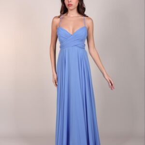 Light blue rope strap draped detail chiffon evening dress with small side cutouts and delicate straps that may need a slight adjustment to accommodate a variety of bust sizes.