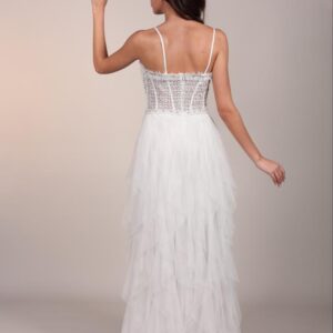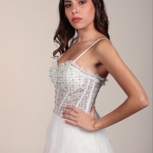 White rope strap, embroidered bodice with bead embellished waist trim with skirt frilly tulle fabric